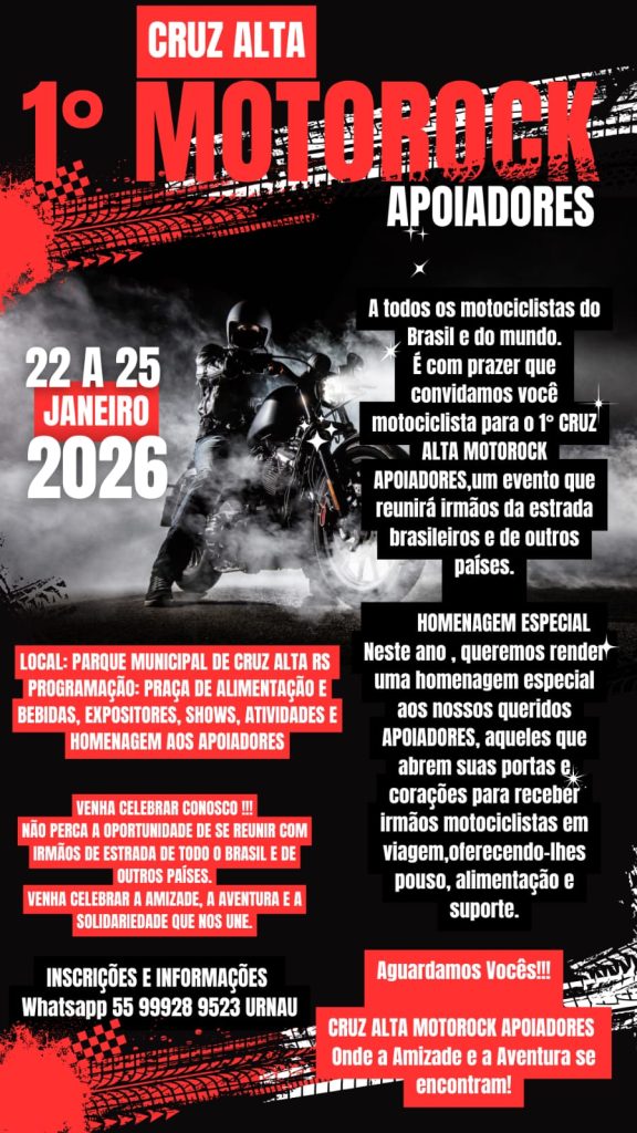 Rogério Urnau e seus parceiros realizam mais um evento das motocas, depois do evento muito bem sucedido em 2025, em Panambi, agora é a hora e a vez de Cruz Alta ser “a capital do motociclismo”.