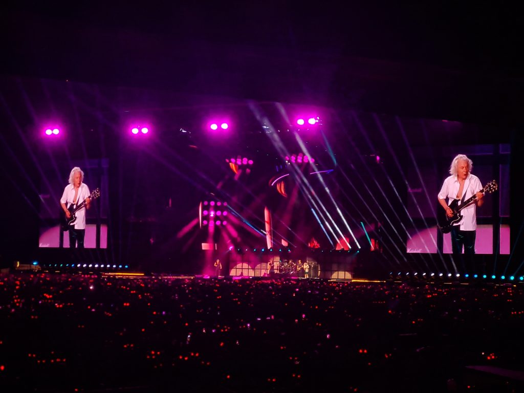 O guitarrista Angus Young, com seu uniforme escolar clássico, parecia incansável aos 70 anos. Corria pelo palco, interagia com o público e disparava riffs e solos que mesmo após décadas de sua criação, ainda fazem um estádio inteiro se emocionar.